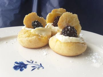 The traditionnal cream puffs revisited : come in lime cream and blackberry, or lemon cream and raspberry, topped with confection sugar !