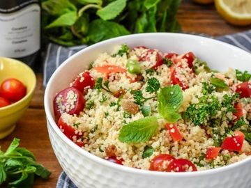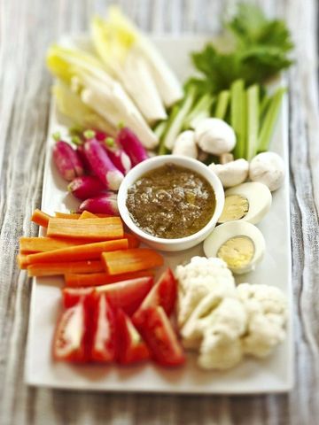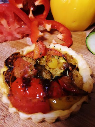 With Mediterranean vegetables - red and yellow peppers, zucchini, eggplant, tomatoes and herbs.