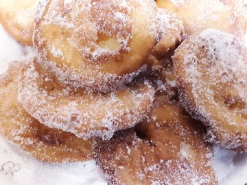 Fresh apples wrapped in a light fried dough, powdered with sugar