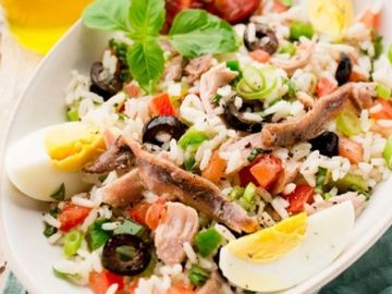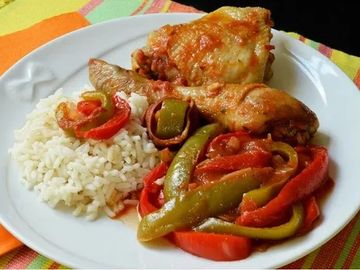 From the Basque region in France, a specialty of chicken simmered in a "piperade" (red and green bell peppers and onions) - served with a portion of white rice.