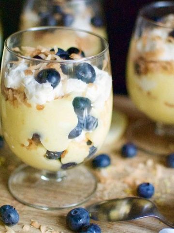 a 3-layer shortbread crust, lemon whipped cream and fresh blueberries