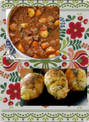 One serving of beef Gulash in a paprika ragu, and a poppy seeds/lemon strudel kind Bejgli pastry