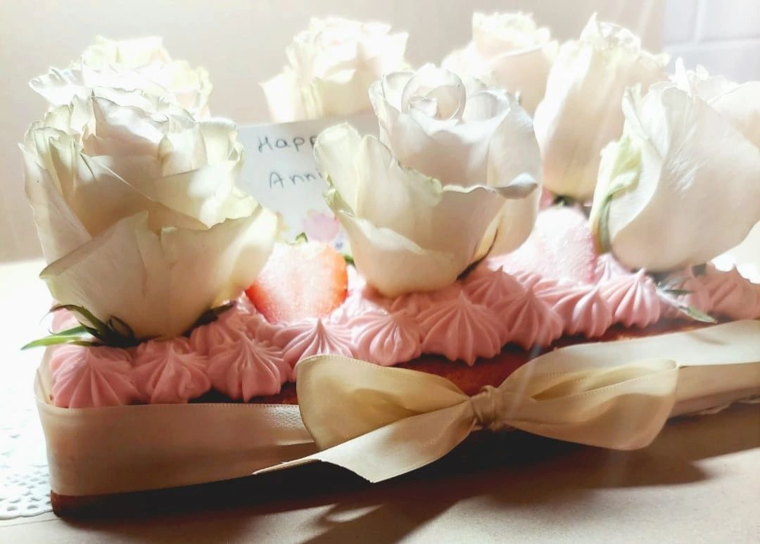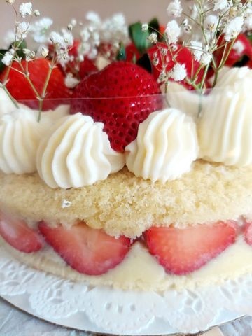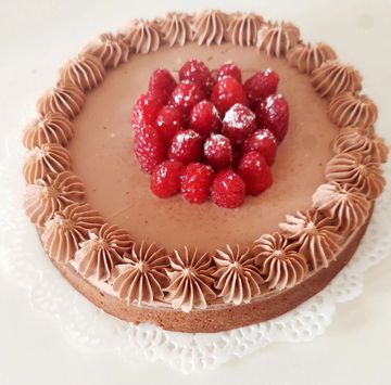 a buttery and soft cake base with fresh raspberries, topped with whipped cream and fresh fruits