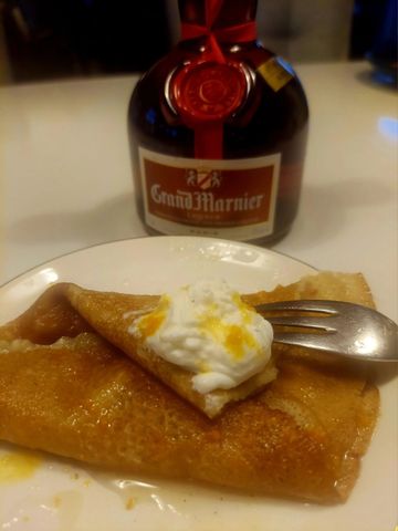 A sweet crepe filled with a orange marmelade, soaked in Grand Marnier