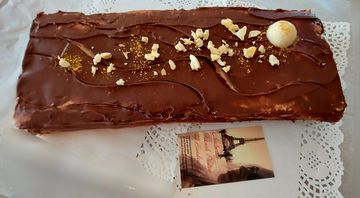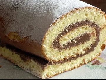 A "génoise" light and fluffy, spread with chocolate, or strawberry, rolled and topped with confection sugar