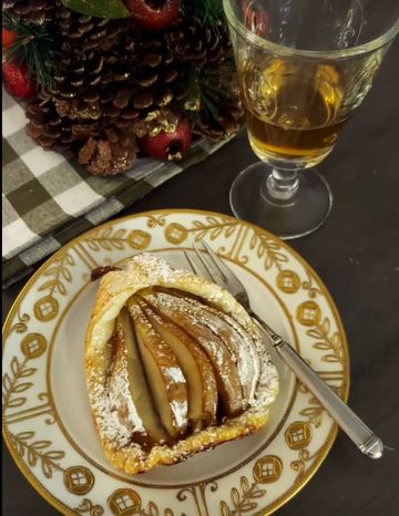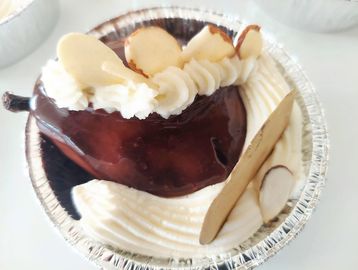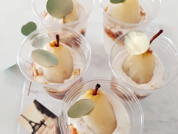 a fresh Barlett pear poached in a French vanilla infusion, wrapped in a slight caramel and delicately surplombing a layer of whipped cream flavored with Christmas spices....