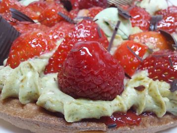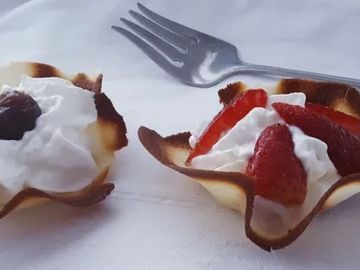 A touch of cream topped with chestnut cream from the Cevennes region of France, or with berries, in a tulip shapped crispy "tuile" cup