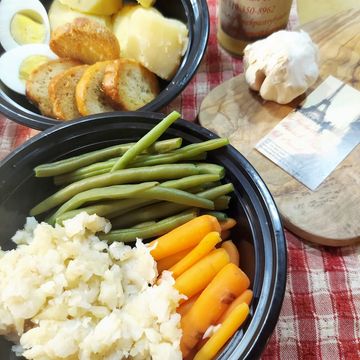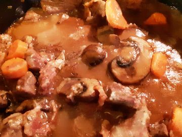 Beef meat, carrots, potatoes, onions, in a French Burgundy wine sauce