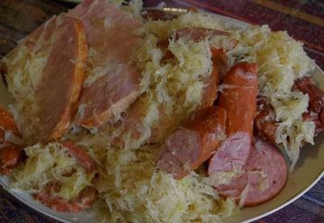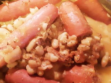 Baked cabbage with an assortment of meats ( sausage/corned beef/pork) and potatoes