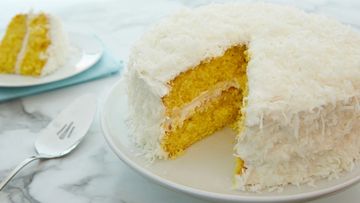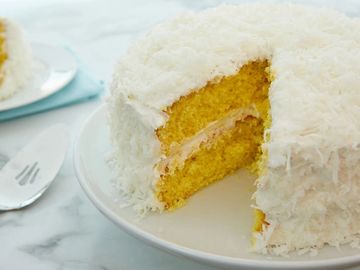 A two-layer lemon cake wrapped in a coconut frosting, sprinkled with coconut flakes and lemon zest