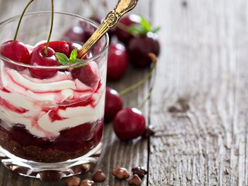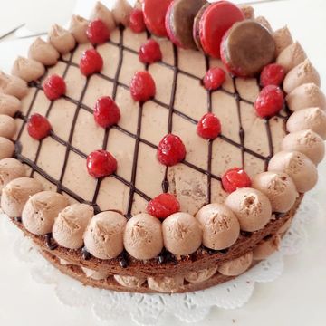 dark chocolate cake, cream, black cherries, chocolate sauce !