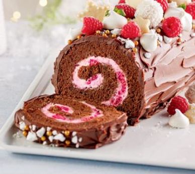 Dark chocolate and raspberries, lemon or orange, also almond/pistachio, the traditional French Christmas cake is the star on the table !